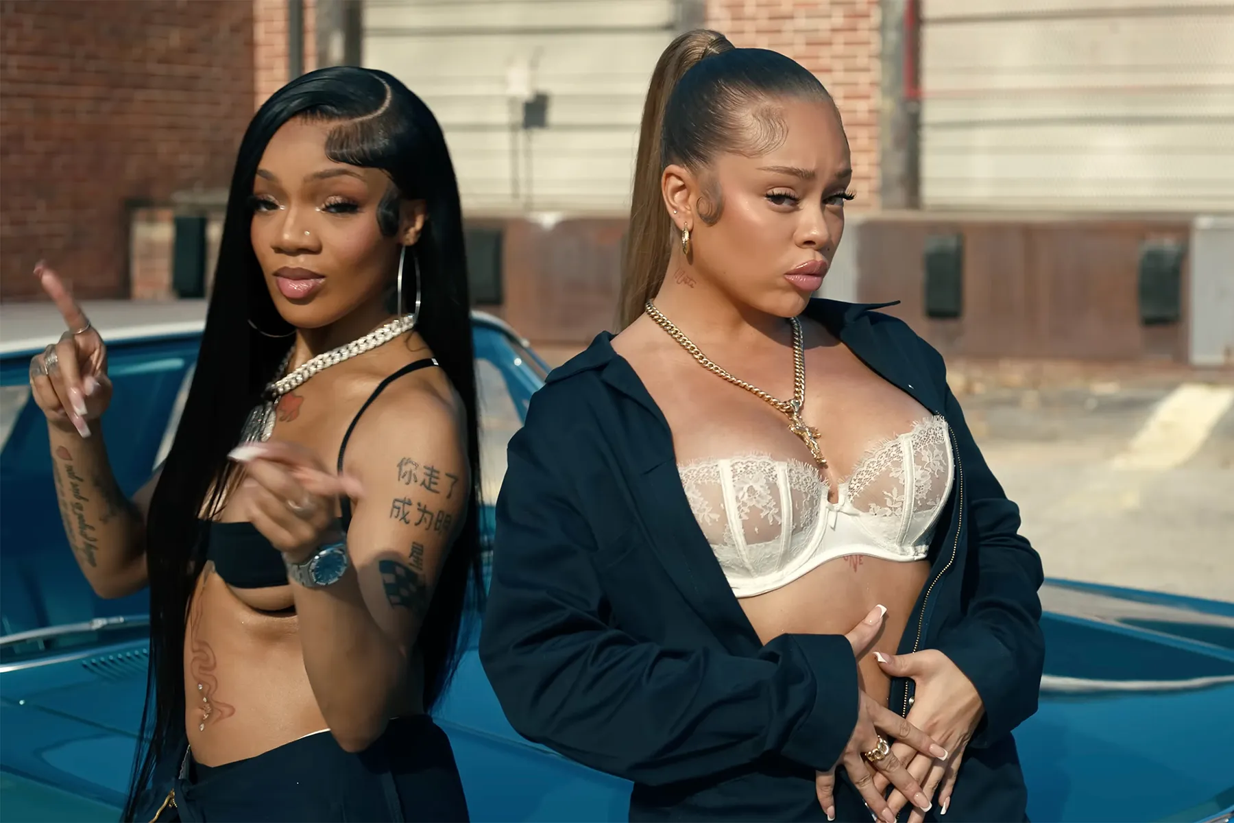 It begins with GloRilla and Latto as two women leaving work frustrated after a long day, in matching white tees, light wash jeans, and blue vests. The video follows GloRilla back at home, dozing off while watching Set It Off. She starts dreaming of herself in the movie.
