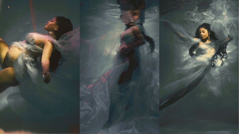 During the shoot, Bailey floats as she strikes poses throughout the water. Bailey switches between holding her belly and posing with her arms in the purple-lit water.
