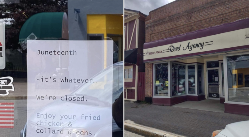 “Juneteenth ~it’s whatever… We’re closed. Enjoy your fried chicken & collard greens,” the sign read in large letters.