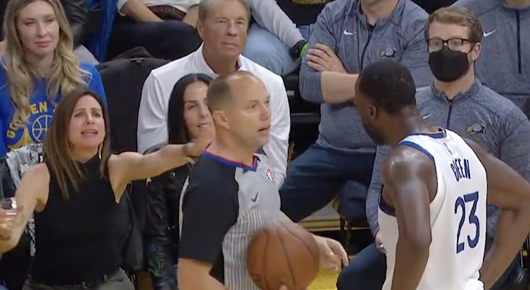 In a viral video of the incident, a worked-up Green made his way to the sidelines to confront the official. While discussing the foul, a woman in the background sitting court-side tried to get Green’s attention. With her wine in hand, she scooted to the edge of her seat and appeared to attempt the power forward from receiving a technical foul.
